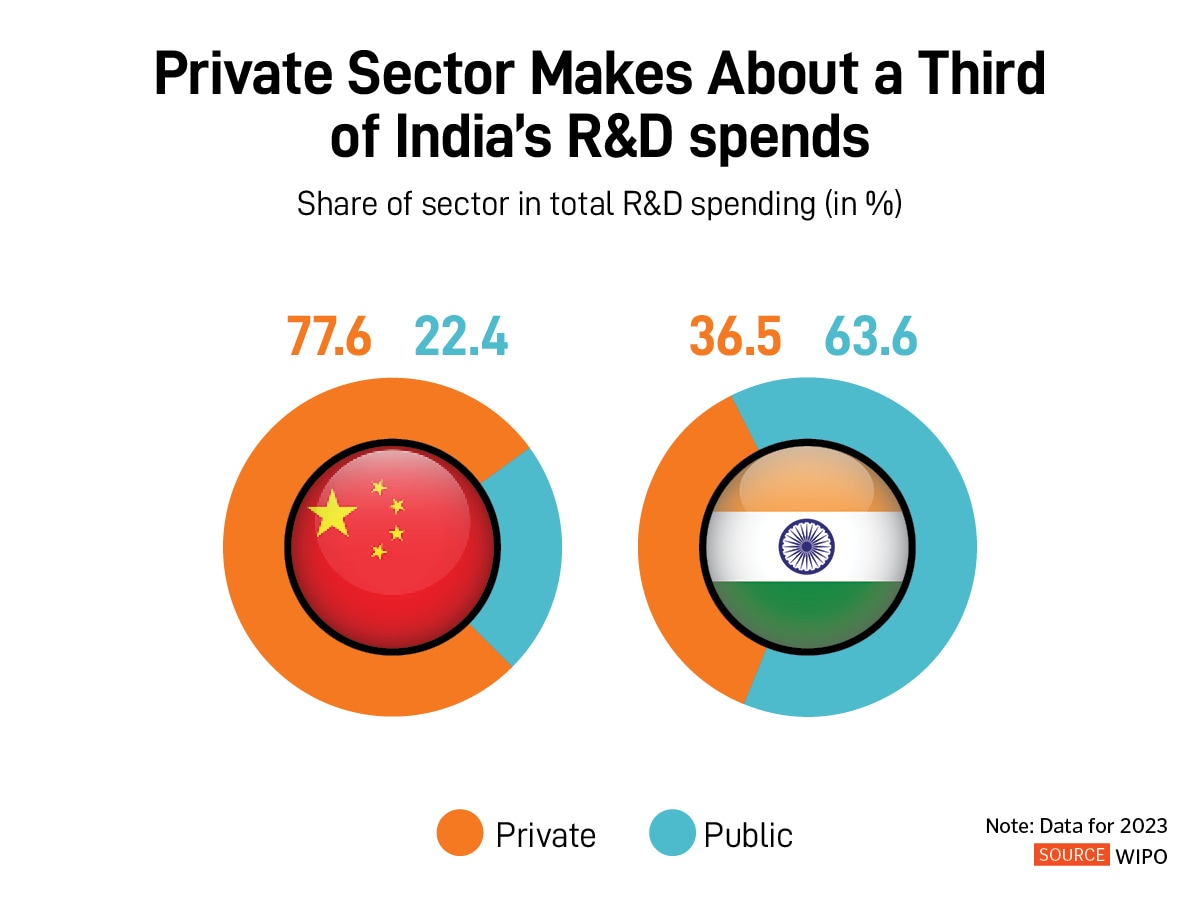 A smaller contribution from the private sector, 37% compared to 78% from China, is a significant reason why R&D spends lag in India