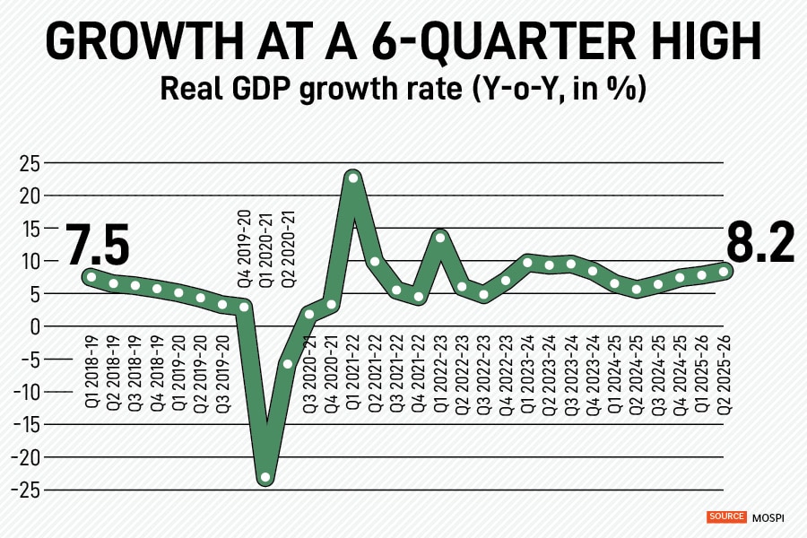 The Indian economy expanded at a rate of 8.2 percent in the second quarter of the current financial year despite market anticipation of some slowdown, according to government data released on Friday. This growth figure, which is a six-quarter high, significantly exceeds the Reserve Bank of India’s (RBI) estimate of 7 percent for Q2 FY26. This marks the third consecutive month in which growth has exceeded 7 percent, following rates of 7.4 percent in Q4 FY25 and 7.8 percent in Q1 FY26.