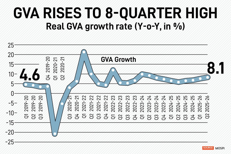 Meanwhile, the gross value added (GVA) also rose to an eight-quarter high of 8.1 percent compared to a 7.6 percent growth seen in the April-June quarter. The manufacturing and financial services sectors were key contributors to the rise in GVA.