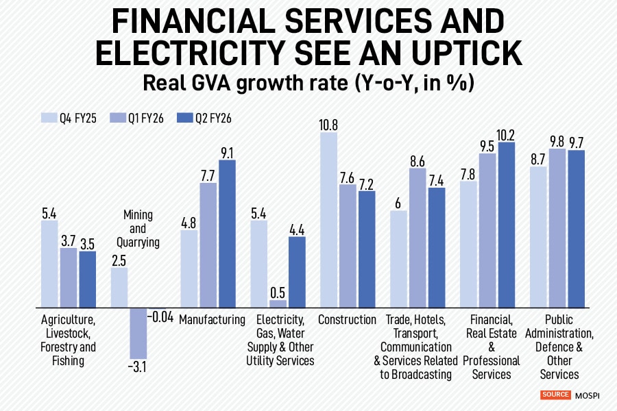 The services sector grew by 9.2 percent in Q2FY26, a slight dip compared to 9.3 percent in the previous quarter which was its highest growth rate in two years. The sector previously grew at a high of 12.5 percent in the first quarter of FY24.