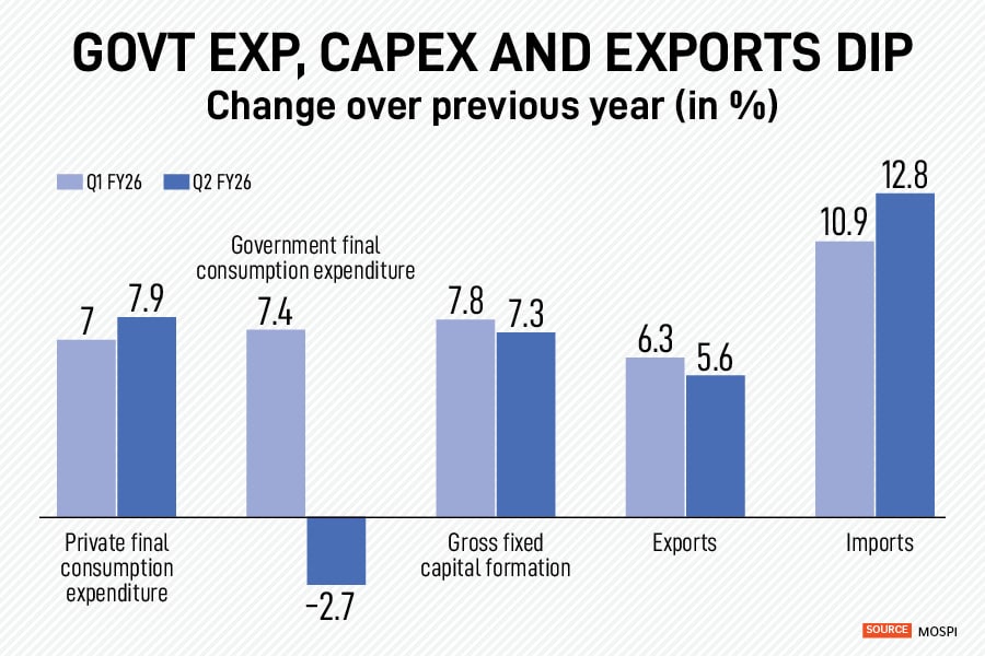 Growth in private consumption picked up from 7 percent in the previous quarter to 7.9 percent in Q2FY26 even as government expenditure contracted on “weak government revenue spending”.