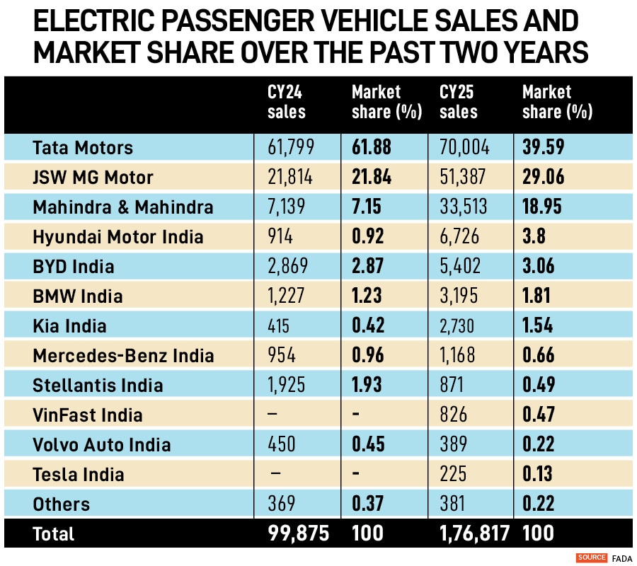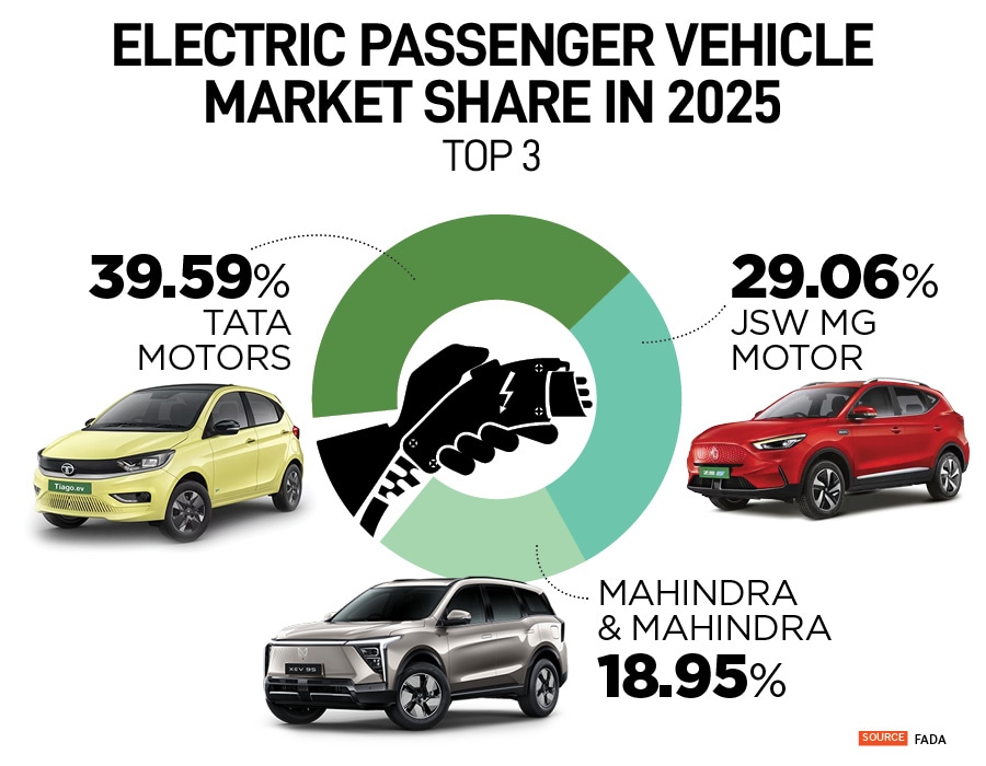 Tata Motors’ grip on the EV market loosened sharply in 2025. Its share fell to 39.6 percent in 2025 from 61.9 percent a year earlier, as MG Motor and Mahindra expanded at a much faster pace. MG’s share rose from 21.8 percent to 29.1 percent, while Mahindra’s nearly tripled—from 7.2 percent to 19 percent.