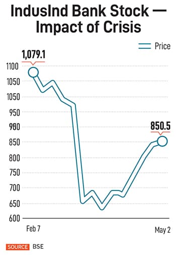 “This will be a mini reset for the bank. The new management will begin with plugging all the gaps and examine current operations more closely," Nitin Aggarwal, head-BFSI (institutional equities) at Motilal Oswal Securities, tells Forbes India. He adds that “one should not benchmark growth to what the bank achieved in earlier years". The IndusInd Bank stock has already been reflecting this (see chart), falling over 40 percent from its February levels. The stock recovered a bit from the March lows—after trading earlier at 0.6x FY27earnings, it is now 1x trailing book, Aggarwal says.
