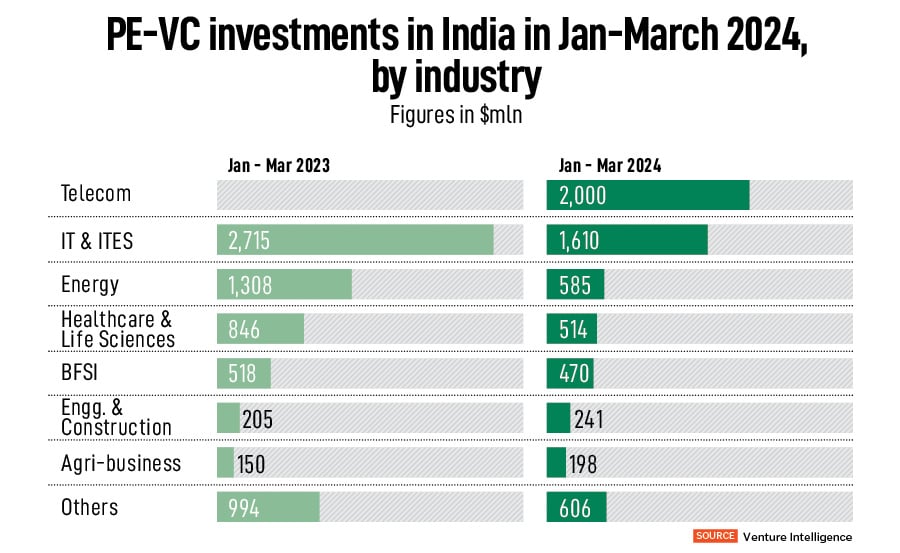 Overall, PE and VC firms invested more than $6.2 billion (across 205 deals) in Indian companies during the first three months of 2024, excluding PE investments in real estate, according to Venture Intelligence. This is an 8 percent fall from the $6.7 billion (across 242 deals) invested in the same period during 2023. The figure is also lower by 6 percent sequentially, meaning in comparison with the immediate previous quarter, the October-December 2023 period, which saw $6.6 billion invested in 200 deals.