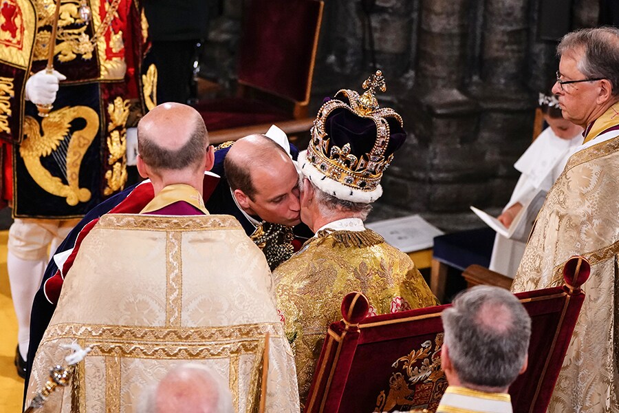 Prince William, Prince of Wales kisses his father, King Charles III, who has just been crowned.