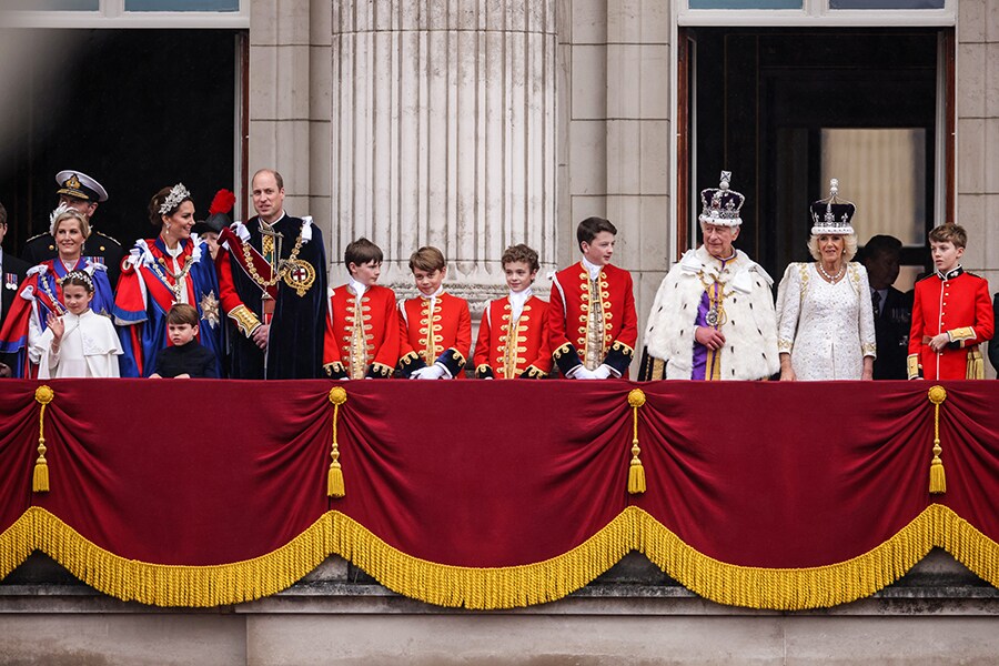 The royal family greet crowds from the Buckingham Palace central balcony, as is custom. Seen here are members including Sophie, Duchess of Edinburgh Vice Admiral Sir Timothy Laurence Princess Charlotte of Wales Prince Louis of Wales Catherine, Princess of Wales Anne, Princess Royal Prince William, Prince of Wales Prince George of Wales, second among the page boys in red King Charles III Camilla, Queen Consort, and Page Of Honour, Freddy Parker Bowles.