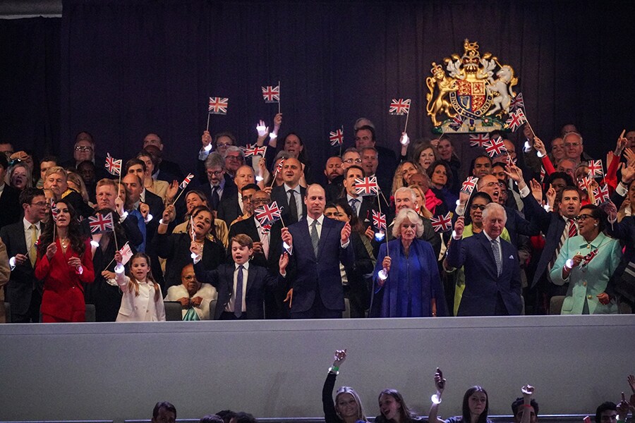 [From left] Catherine, Princess of Wales Princess Charlotte Prince George Prince William, Prince of Wales Queen Camilla King Charles III Patricia Scotland, Baroness Scotland, in the Royal Box at the Coronation Concert.