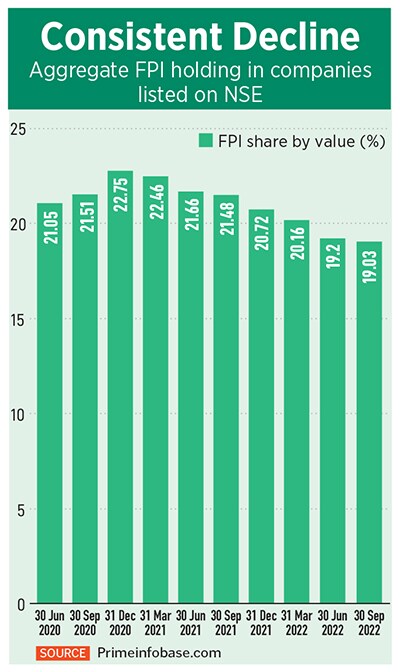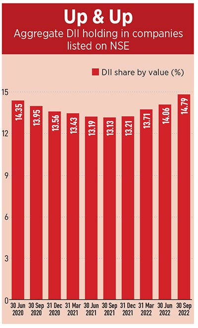 The widest gap between FPI and DII holding was in quarter ending March 31, 2015, when DII holding was 55.45 percent lower than FPI holding. “The FPI to DII ownership ratio also declined to all time low of 1.29 as on September down from 1.37 as on June 30, 2022. Over a 13-year period (since June 2009), FPI share has increased from 16.02 percent to 19.03 per cent while DII share has increased from 11.38 percent to 14.79 percent. This further showcases the rise of domestic investors and the huge counter balancing role they have played to foreign investors," Haldea adds.