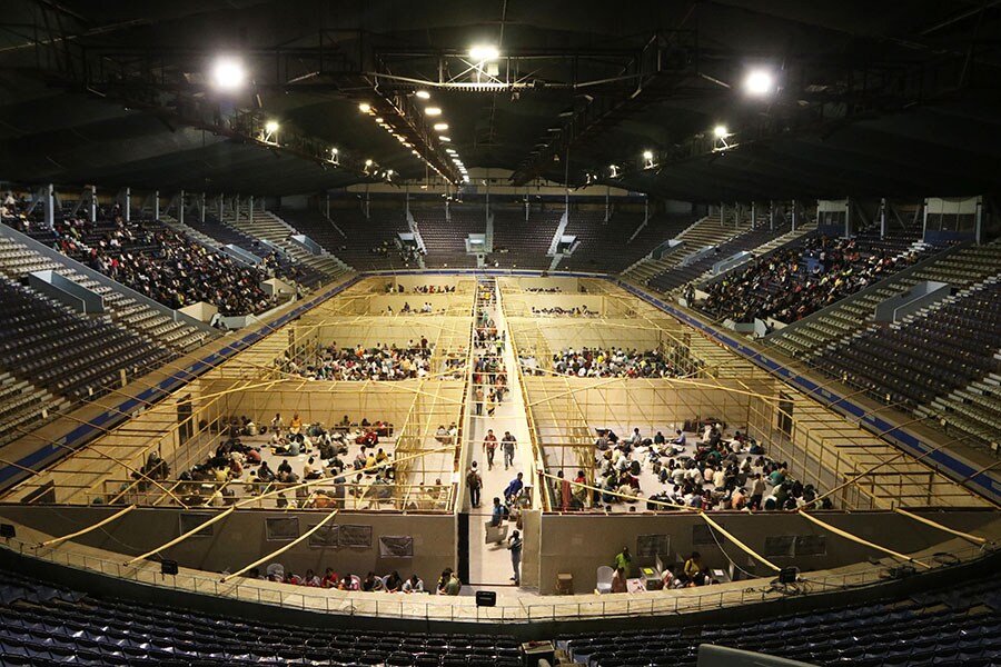 Travelling long distances, polling officials gather at the distribution centre in Netaji Indoor Stadium, Kolkata, on May 31, 2024, to collect electronic voting machines (EVM), ballot units, and other election materials ahead of the final phase of the 2024 elections.