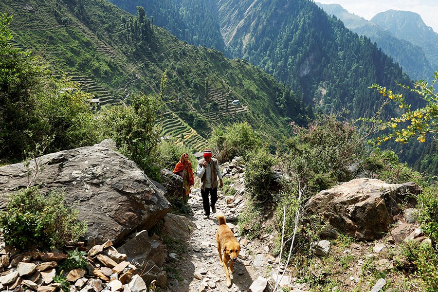 A Bakharwal breed dog leads a couple from Almi, a remote Himalayan hamlet in Chamba district, as they step out to vote in the final phase of the general elections in Himachal Pradesh on June 1, 2024. Polling officials trudged up treacherous Himalayan mountain paths and across rickety bridges for seven hours to set up a polling booth.