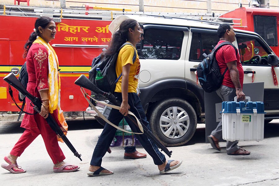 Security team follows polling officials carrying EVMs and other election materials at a distribution centre in BS College Danapur, Patna, on the eve of the seventh phase of the Lok Sabha election on May 31, 2024.