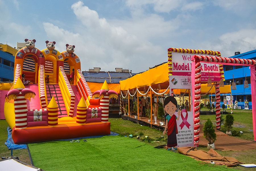 A recreational facility awaits children outside a pink booth set up to empower safe, accessible voting for women in Kolkata, India, on June 1, 2024.