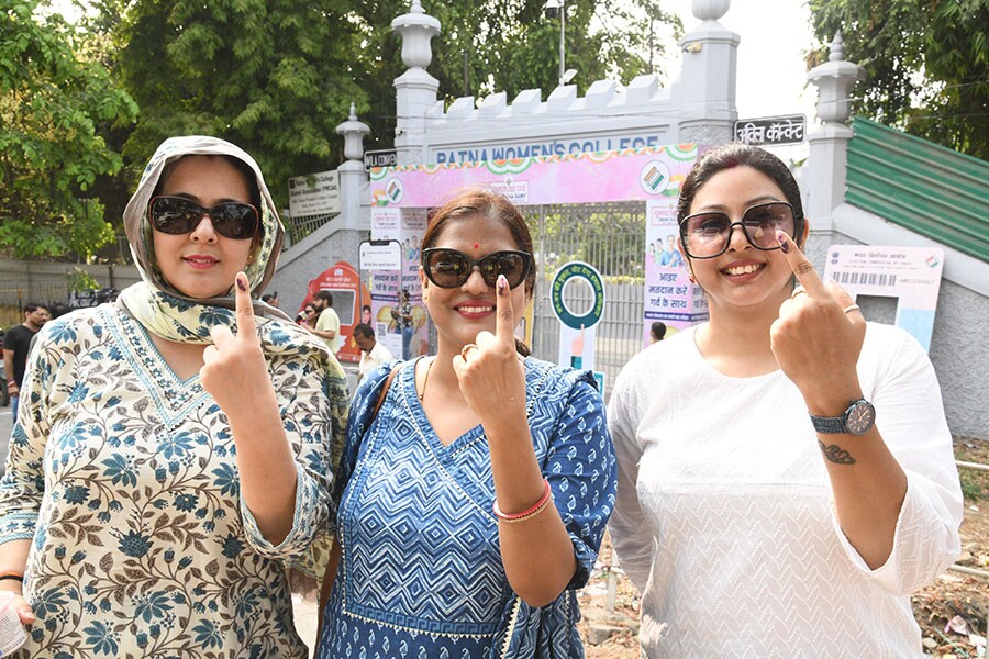 Young women show their inked fingers after casting votes at a polling booth in Patna Women"s College, Bihar, on June 1, 2024.
