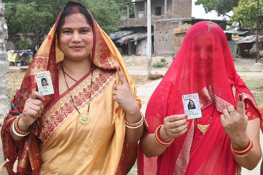 Women from Danapur-Diyara, a village 12 km from Patna, pose for a photo after casting their vote at a polling booth on June 1, 2024, in Patna, India. Most villagers from Diyala take rickety wooden boats across the Ganga to reach Patna.