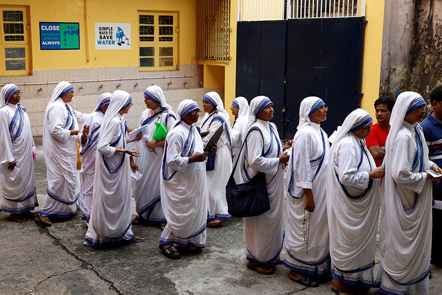 Catholic nuns from the Missionaries of Charity, the global order of nuns founded by Saint Mother Teresa, wait in a line to vote at a polling station during the seventh and last phase of India"s general election in Kolkata, India, on June 1, 2024.