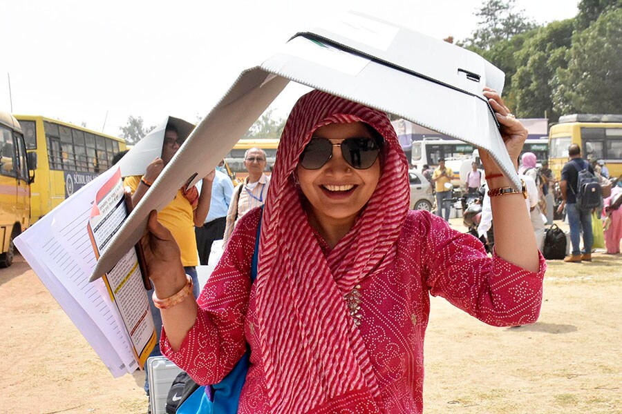 A cheerful polling official puts an election print material to use, shielding herself from scorching heat at a distribution centre in Gandhi Maidan, Patna, on the eve of the final phase of the Lok Sabha election on May 31, 2024.