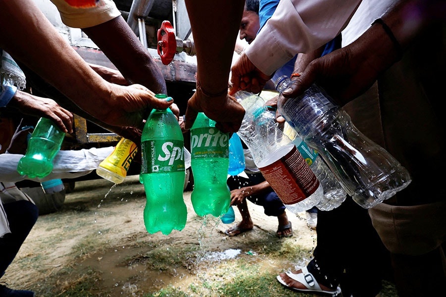 Polling officials gather around a water tanker to fill their bottles at a distribution centre for election materials ahead of the seventh and last phase of India"s general election on a hot summer day in Varanasi on May 31, 2024.