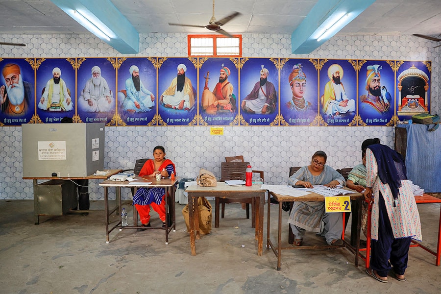 Portraits of Sikh gurus flank polling officers in a hall set up as a polling station in Faridkot district, Punjab, on June 1, 2024.