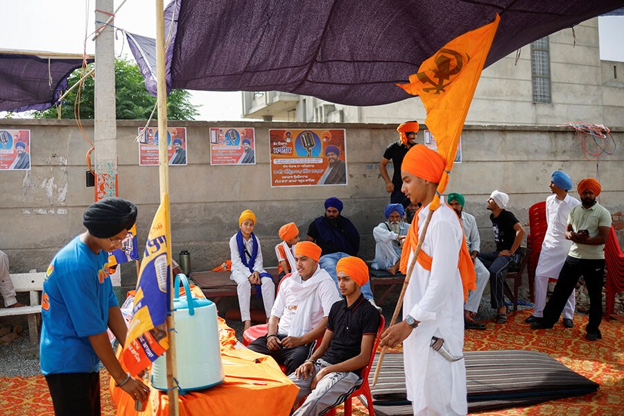 Supporters of Sikh separatist leader Amritpal Singh, an independent candidate, sit under shade outside a polling station in a village in Firozpur, Punjab, on June 1, 2024.