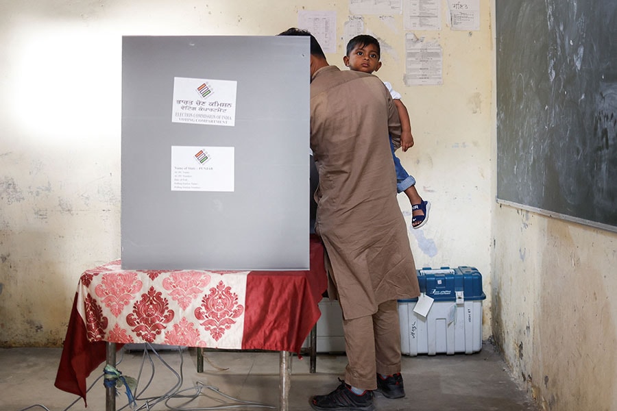 A man holds his son as he votes at a polling station on June 1, 2024, during the seventh and last phase of the general election in Firozpur district, Punjab.