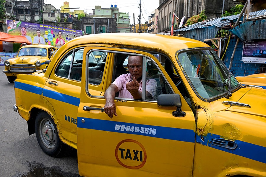 The driver of the iconic, dwindling yellow taxi shows his inked finger after casting his ballot to vote during the seventh and final phase of voting in India"s general election, along a street in Kolkata on June 1, 2024. The dwindling metered yellow taxis can now be booked through an app, a brainchild of West Bengal"s Department of Information Technology & Electronics.
