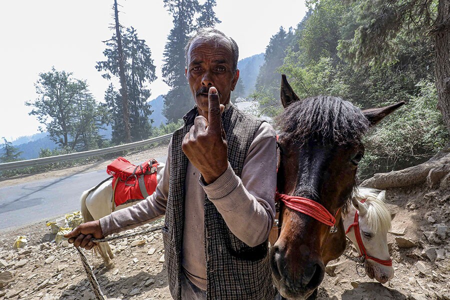 A man walking with his ponies shows an indelible ink mark on his finger after casting his vote in Kufri, Himachal Pradesh state, on June 1, 2024. Over the last year, the National Green Tribunal panel has heavily criticised horses and ponies for damaging Kufri"s green forest.