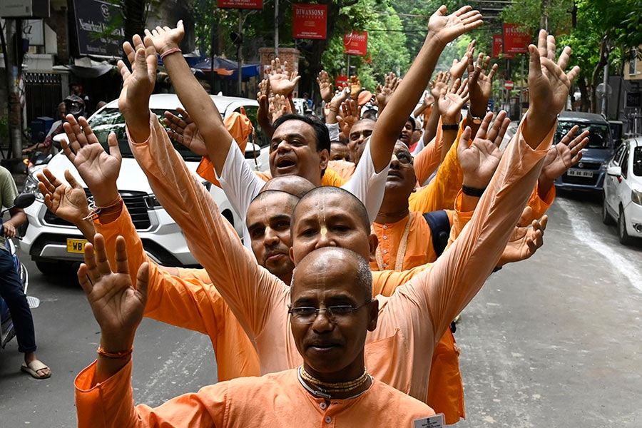 Monks of ISKCON Temple sing and chant with gusto while in a queue to cast their ballots at La Martiniere School on June 1, 2024, in Kolkata.