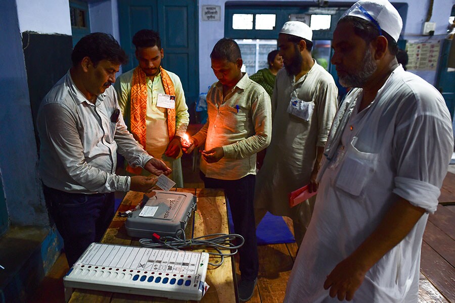 Polling officials seal electronic voting machines at a polling booth at the end of the voting day on June 1, 2024, in Varanasi, India. The Election Commission of India has deployed advanced technology, including electronic voting machines and a Voter Verifiable Paper Audit Trail, to ensure a secure and transparent voting process.