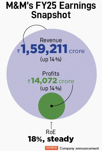 The fiscal year ended March 2025 saw M&M deliver a top line of Rs159,211 crore, up 14 percent from the previous year. In the same period, profits stood at Rs14,073 crore, also up 14 percent. For its core automotive business, the revenue market share went up to 25.3 percent, a growth of 210 bps. Every rupee put in by shareholders in the business delivered 18 paisa of return or two-and-a-half times what a 10-year risk-free government bond would give an investor. Mahindra hopes to do better in the years to come.