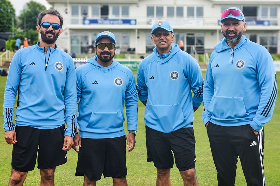 (L-R) Batting coach Vikram Rathour, fielding coach T Dilip, head coach Rahul Dravid, and bowling coach Paras Mhambrey Image: Courtesy Aaquib Wani