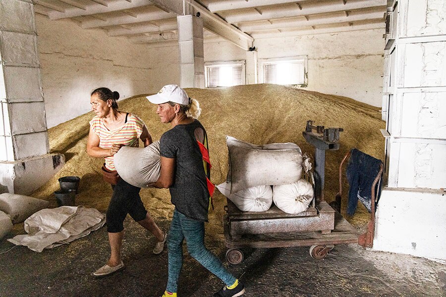 Ukrainians load bags of barley inside one of Serhiy Sokol’s warehouses near the town of Zelenodilsk, Ukraine on July 28, 2022. Sokol said he and his farmhands plucked dozens of aluminum tubes from Russian rockets from the black earth as they worked his fields. (David Guttenfelder/The New York Times)
