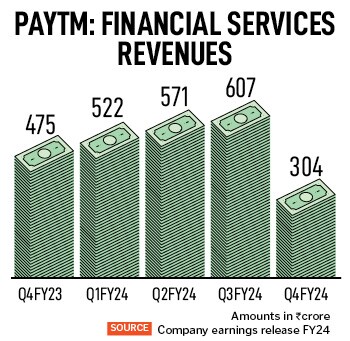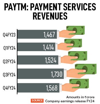 In Q4FY24, payments revenue was down by 9 percent from the previous quarter due to the disruption of PPBL products and a temporary impact on account of a conservative approach taken for certain businesses and temporary disruptions in operating metrics (MTU, merchant base, GMV). But for the full year payments revenue grew by 7 percent year-on-year to Rs 1,568 crore.