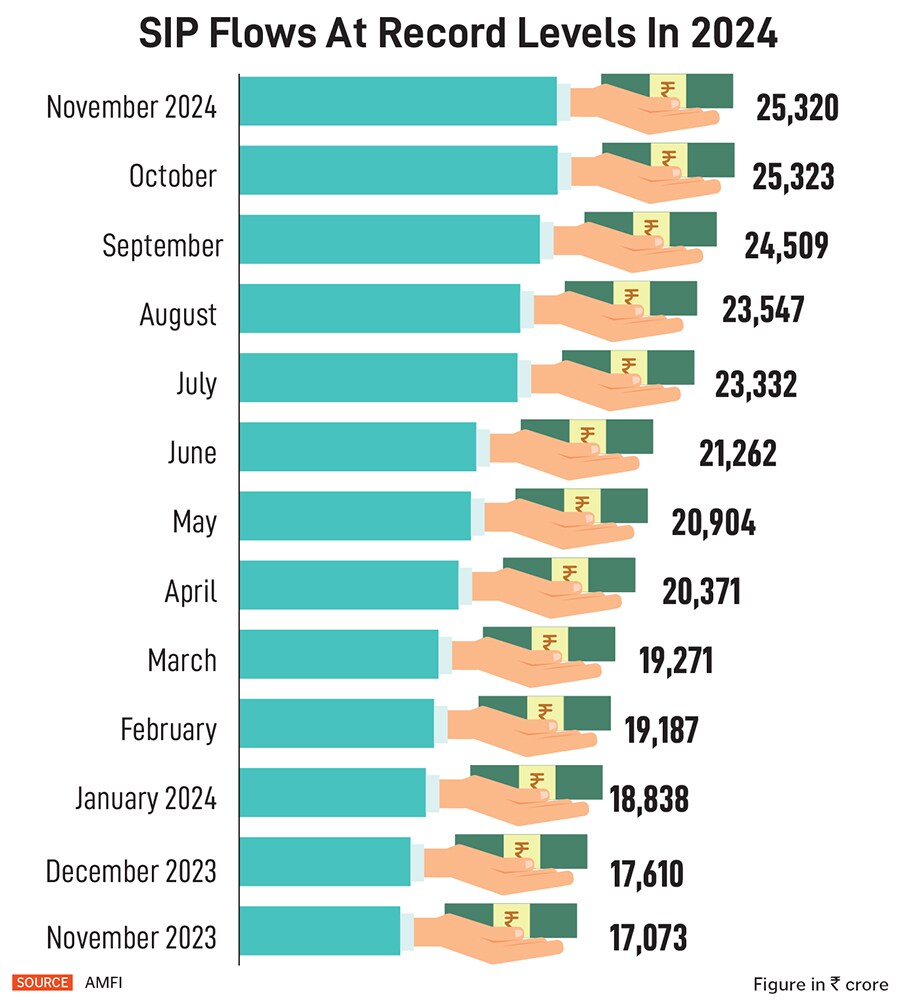 The monthly flow of money through systematic investment plan (SIP) has been growing, hitting a record at Rs25,323 crore in October. Monthly SIPs have been rising above Rs15,000 crore per month since July 2023.