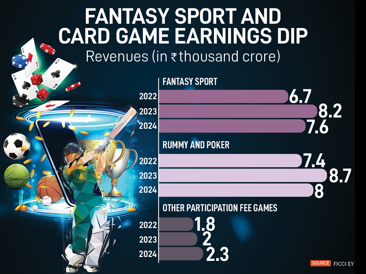 Fantasy sport and card games (rummy and poker), where revenues exceeded Rs 8000 crore in 2023, dipped by more than 7 percent the following year. In contrast, games that charge players a participation fee raked in about Rs 2000 crore.