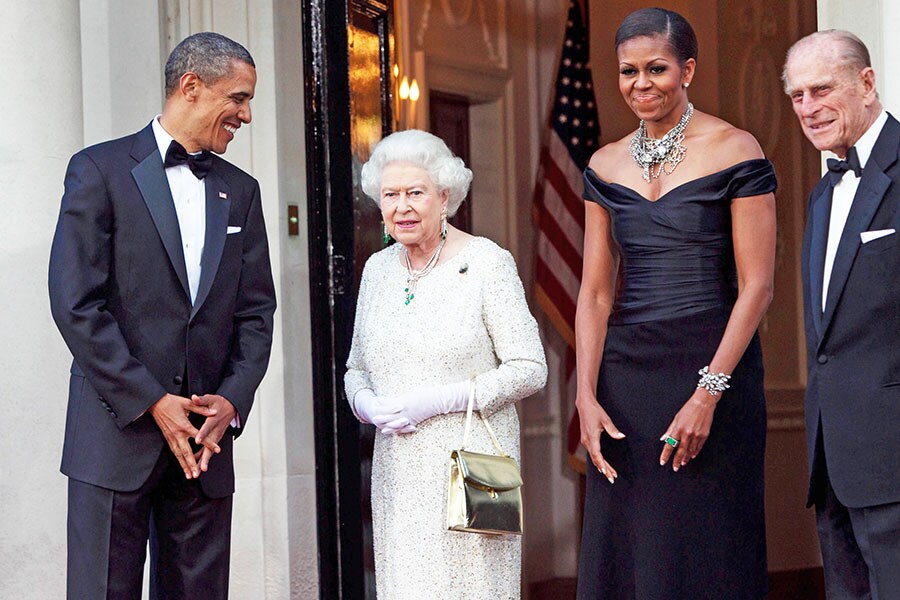 Queen Elizabeth, second from left, and Prince Philip, the Duke of Edinburgh, right, are welcomed by President Barack Obama and first lady Michelle Obama to a dinner in the queen’s honor at Winfield House in London, the residence of the ambassador from the U.S., on May 25, 2011. (Doug Mills/The New York Times)