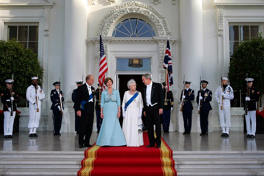 Queen Elizabeth, second from right, and Prince Philip, the Duke of Edinburgh, left, are welcomed by President George W. Bush, right, and first lady Laura Bush to a state dinner at the White House on May 7, 2007. Queen Elizabeth, who inherited the throne at age 25 in 1952 and became Britain’s longest-serving monarch, died on Sept. 8, 2022. She was 96. (Doug Mills/ The New York Times)