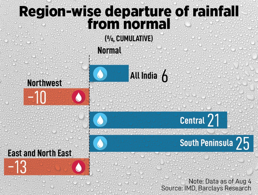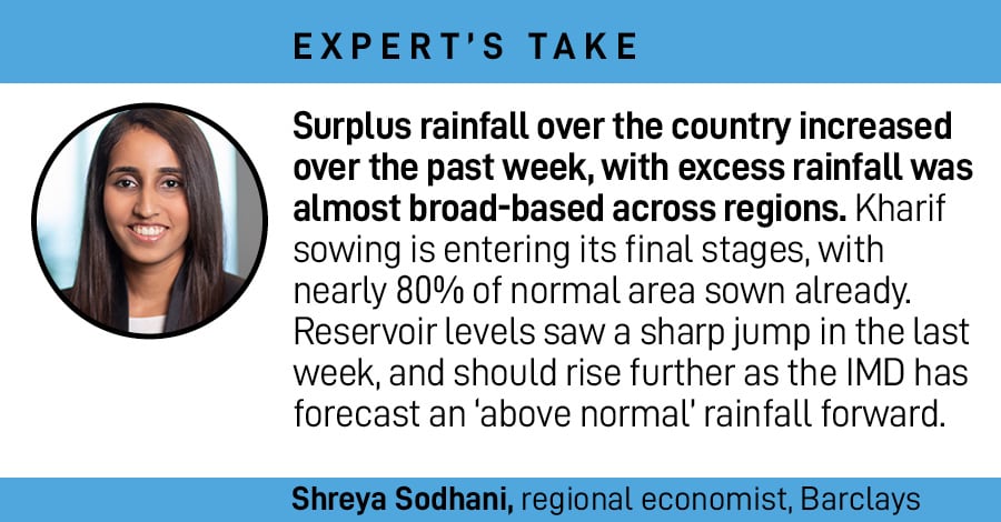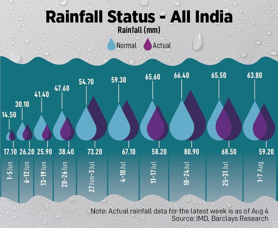 On a cumulative basis, rainfall was 6.3 percent above the long-period average (LPA) as of August 4, according to Indian Meteorological Department (IMD) data analysis by Barclays. This compares to 2.7 percent LPA rainfall in last week. With that, the first half of the monsoon season concluded with another week of above-average rainfall, says Barclays.