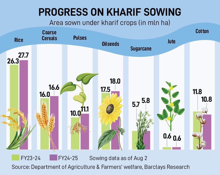 Area coverage under rice, which was lagging year-on-year until the week ending July 26, picked up significantly over the past week, and is now 5.3 percent higher. Acreage for coarse cereals, pulses, oilseeds and sugarcane is also higher, but that for cotton is significantly lower (-8.8 percent YoY). This is likely driven by farmers" decisions to shift towards growing pulses/maize amid lower cotton prices, says Barclays.