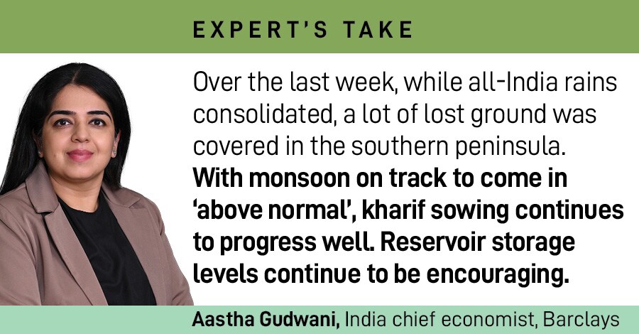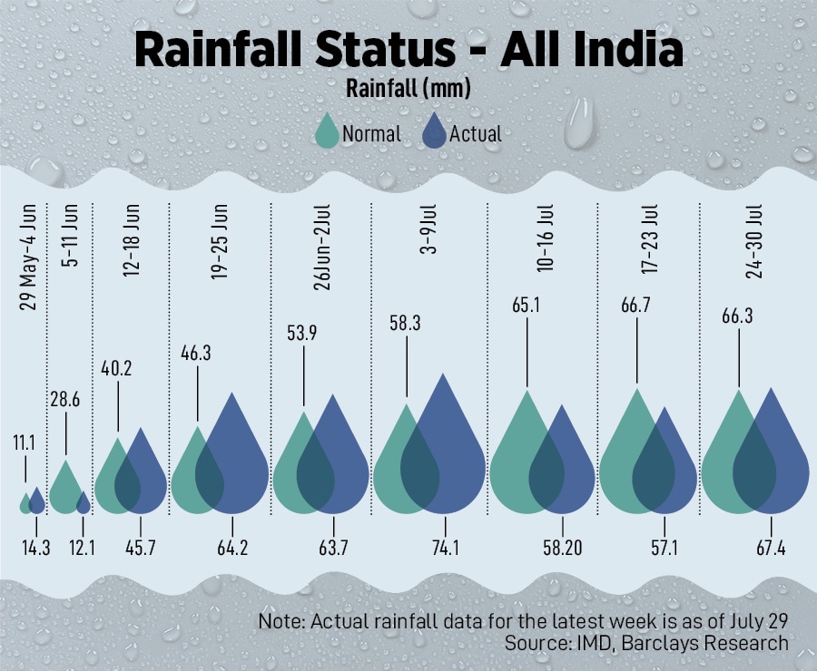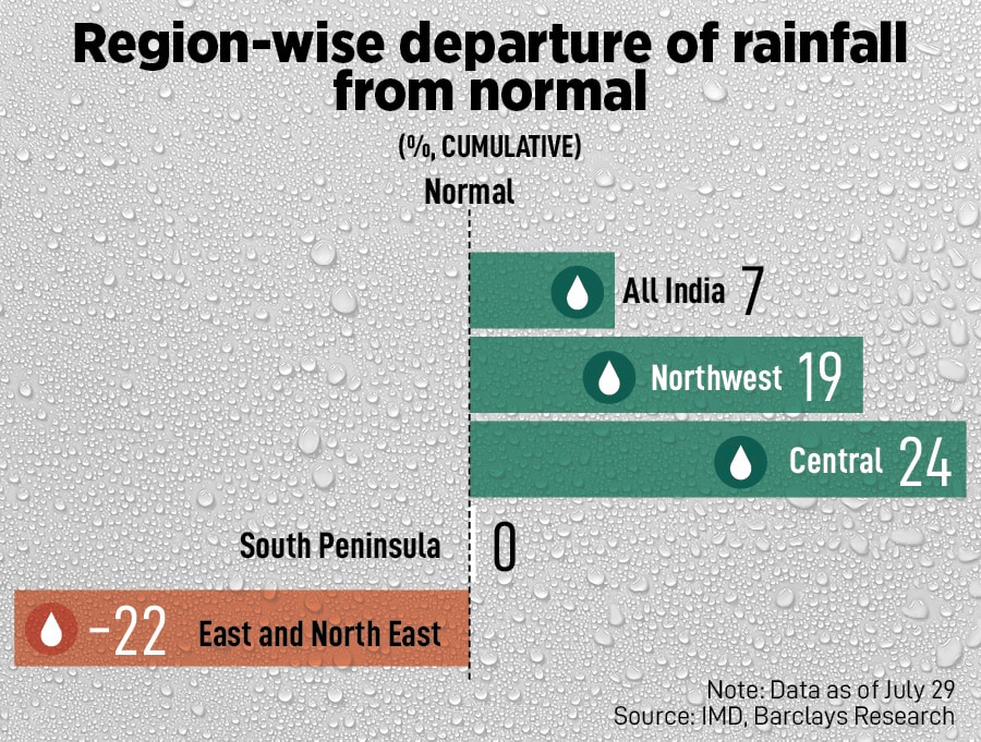 Season-to-date or cumulatively, monsoon rainfall is 7 percent above the long period average (LPA), based on India Metrological Department (IMD) data analysis by Barclays. However, weekly rainfall across other regions slowed down while deficit in the east and north-eastern part, except the southern peninsula, worsened.