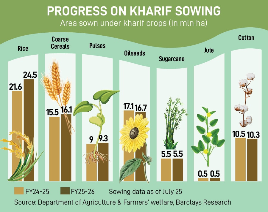 As of July 25, the area covered under kharif crops was 76 percent of the normal area. Crop wise, sowing in rice has accelerated.