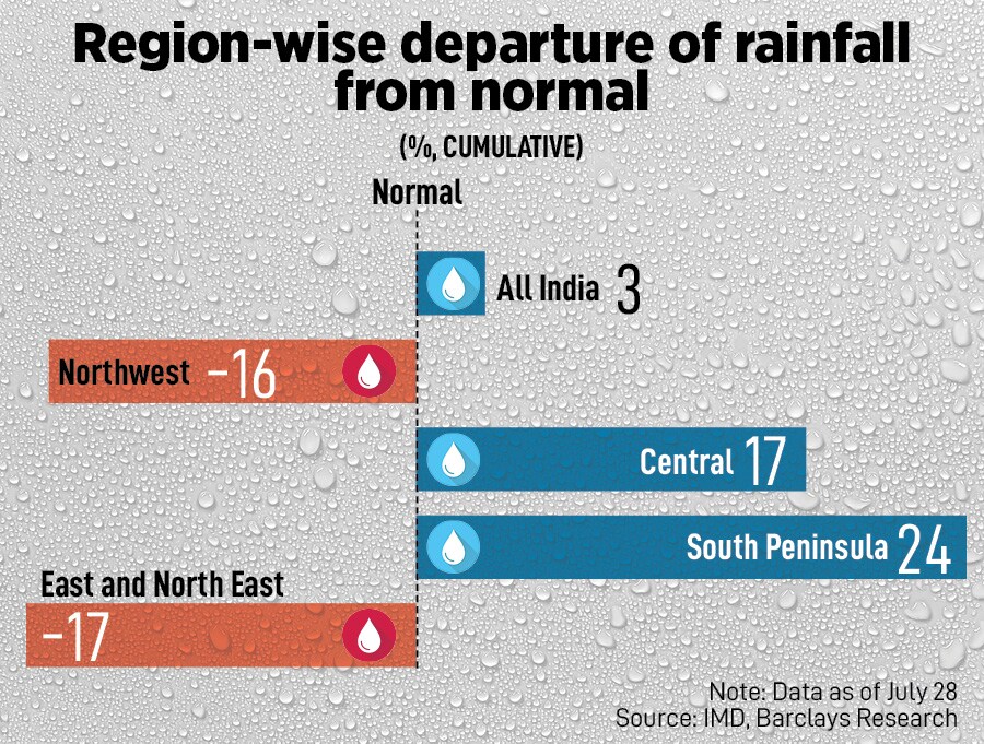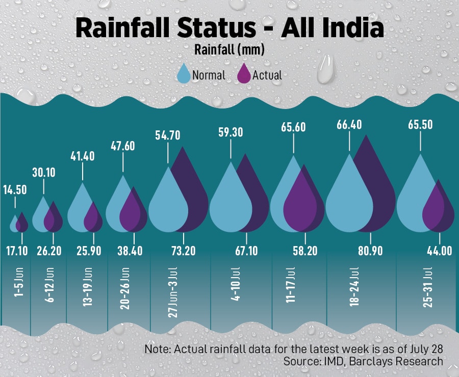 However, as uneven distribution of rains continues, the southern and central regions have cumulatively seen excess rainfall, while rains in the northwest and eastern states are deficient. “This gap also widened over the past week, with an increase in the number of subdivisions seeing excess rainfall," says Shreya Sodhani, regional economist, Barclays.