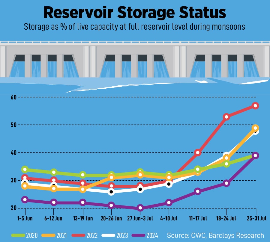 Meanwhile, as of July 25, storage in 150 reservoirs was at 39 percent of total capacity, which is higher than 29 percent in previous week. Though in terms of historical trends, storage levels remain low, it translates to 82 percent of the live storage of the corresponding period of last year and 96 percent of normal storage.