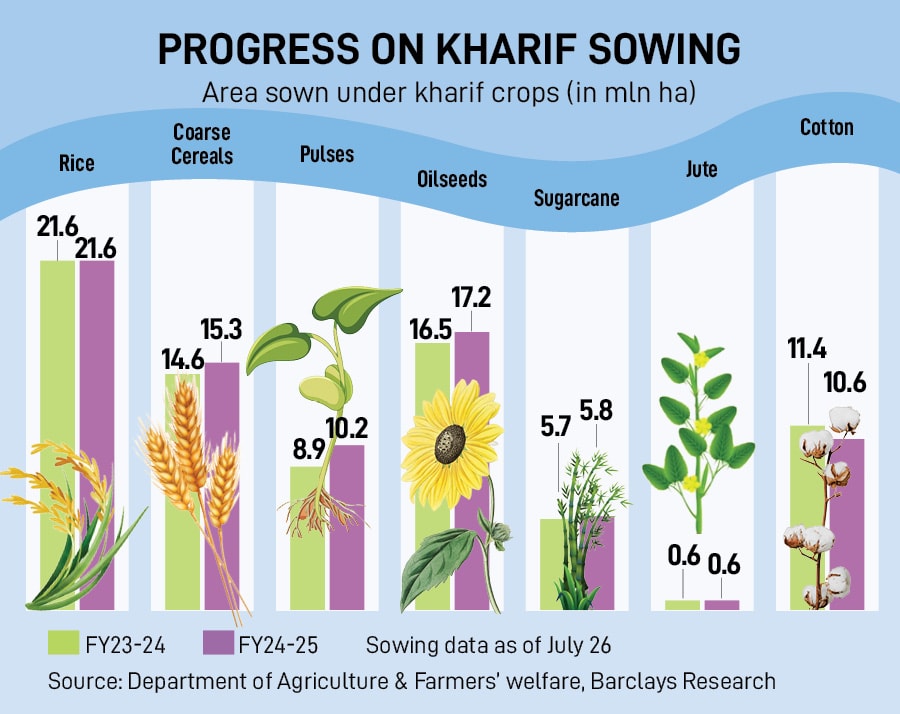 As of July 26, the area sown is 81.2 million hectares (ha mln), higher than the 79.4 ha mln in previous year. According to Barclays analysis, data till July 19 indicates that sowing is complete for 64 percent of the normal area.