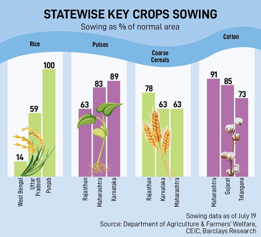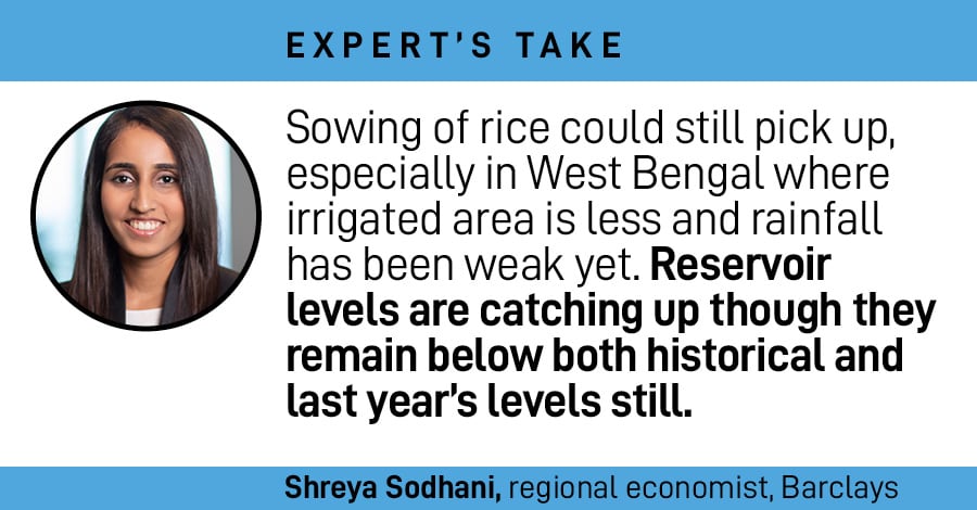 However, sowing of rice is lagging slightly compared with the previous year, while that in coarse cereals, pulses and oilseeds is 3-14 percent higher year-on-year. “The slower sowing in rice nationally is mostly due to a smaller area sown in West Bengal, driven by deficient rainfall so far, while that in Uttar Pradesh and Punjab is progressing comparatively better," says Sodhani. Punjab is also experiencing below average rainfall, but Sodhani feels differences in irrigation coverage is driving the difference in sowing progress.