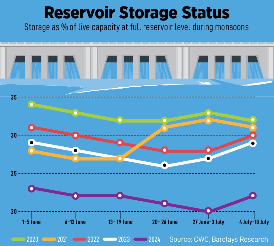 With excess rainfall in almost all the regions over the past week, reservoir levels are likely to improve, but may still remain below the historical trend in the near term, unless the current rainfall activity maintains the same intensity, says Barclays.