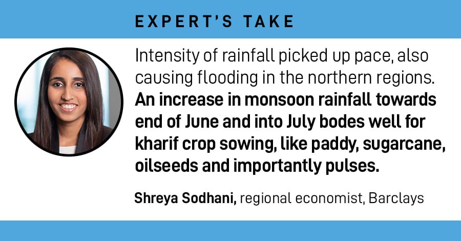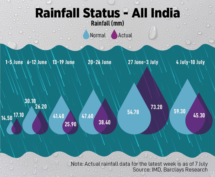From the period June 1 to July 7, rainfall levels are in ‘normal" range on a cumulative basis of 2 percent above the long period average (LPA), as per Barclays analysis of Indian Meteorological Department (IMD) data. This compares to an 11 percent deficit as on June 30. The IMD expects an ‘above normal’ monsoon in July.