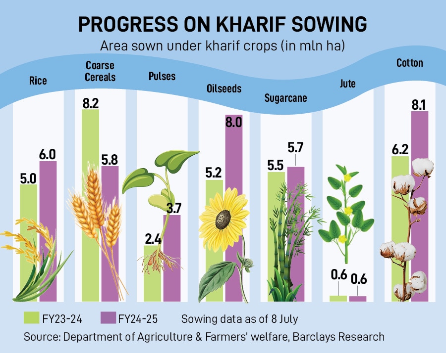 Overall rainfall has improved, turning around to surplus from deficit, while sowing of kharif crops like paddy, cotton, oilseeds and sugarcane show significant jump