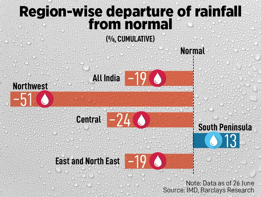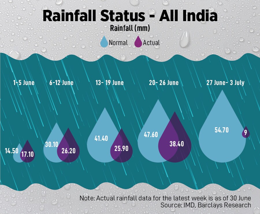 As of June 30, rains were 11 percent below the long-period average (LPA) on a cumulative basis, based on Indian Meteorological Department (IMD) data analysis by Barclays. In the previous week ended June 23, rainfall deficit was at 18 percent.