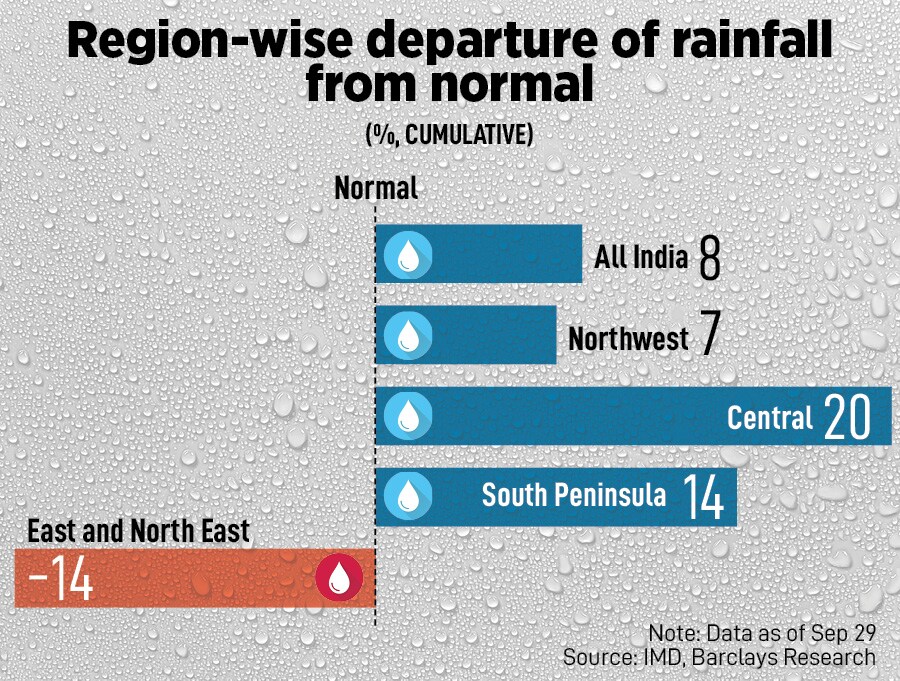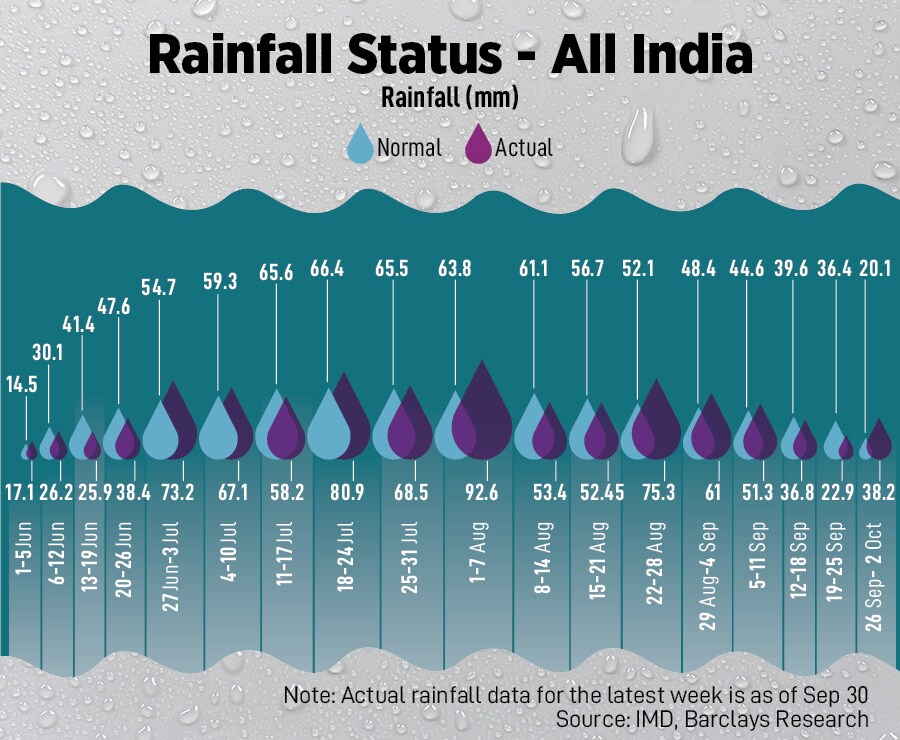 In the last week of monsoon, many regions received heavy rainfall due to the forming of a low-pressure system, and at the same, time withdrawal of the southwest monsoon continued. On a cumulative basis, rainfall was 7.8 percent above the long period average (LPA) as of September 29, as per an analysis of Barclays based on Indian Meteorological Department (IMD) data. This is an increase from 5.5 percent in the previous week, indicating the monsoon season ending with “above normal" rainfall.