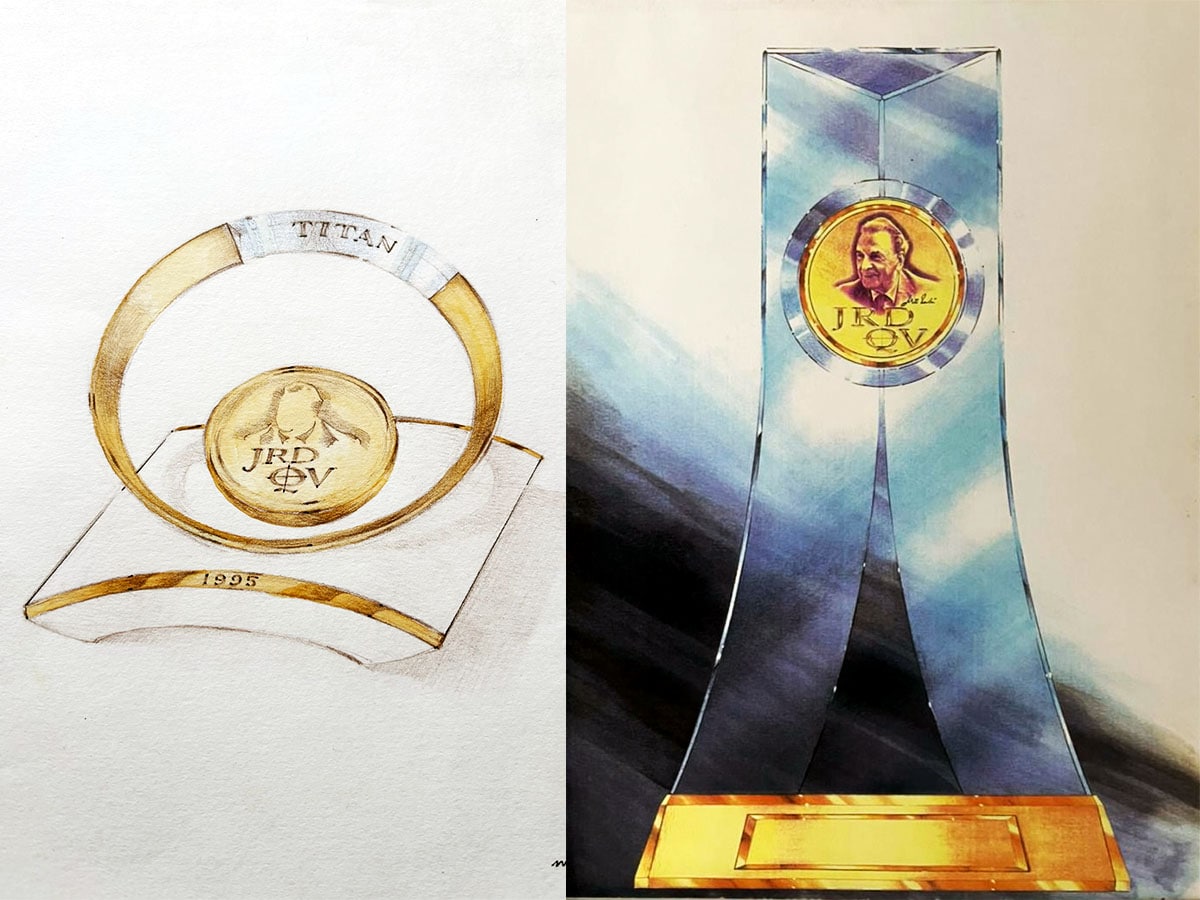 Some of these creative endeavours led to my interactions with Ratan Tata. I remember accompanying Xerxes Desai, the then MD of Titan Company, to Tata’s office for a briefing on the design of the JRD QV trophy, the highest award in the group for business excellence. The weight of it all was stressful at the beginning, but I instantly felt comfortable the moment Tata started sketching on a notepad to explain his thoughts behind what the trophy should be. He spoke of the never-ending pursuit for perfection and drew two opposing parabolic curves, echoing a continuous strive towards excellence. It took me two weeks of repetitive meetings, showcasing watercolour sketches of a range of trophy ideas, finally arriving at the one that we see today crafted in crystal embedded with a vermeil medallion graced with an engraving of JRD Tata’s bust. Tata had a fine eye for detail, a great sense of form and proportions, an affinity for typography, and was passionate about watches!